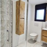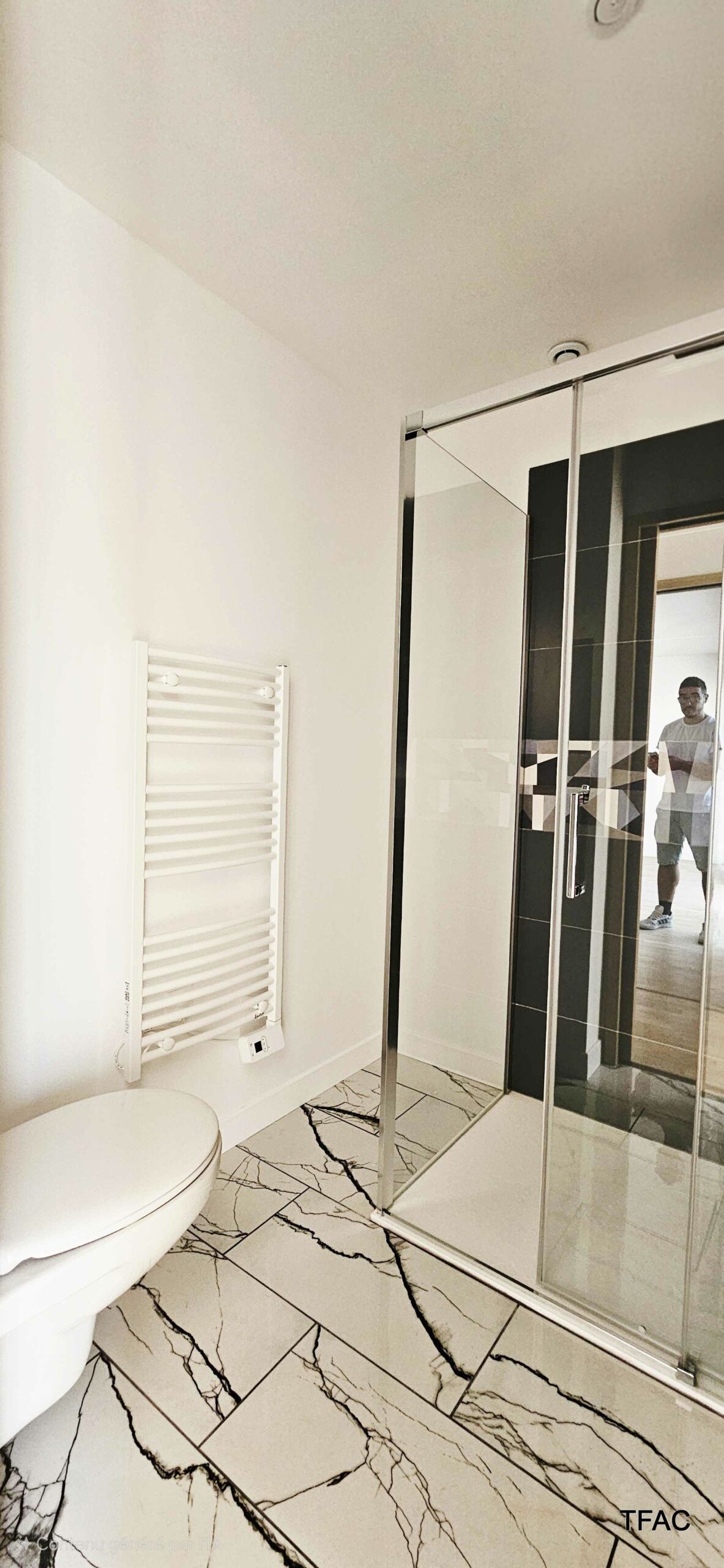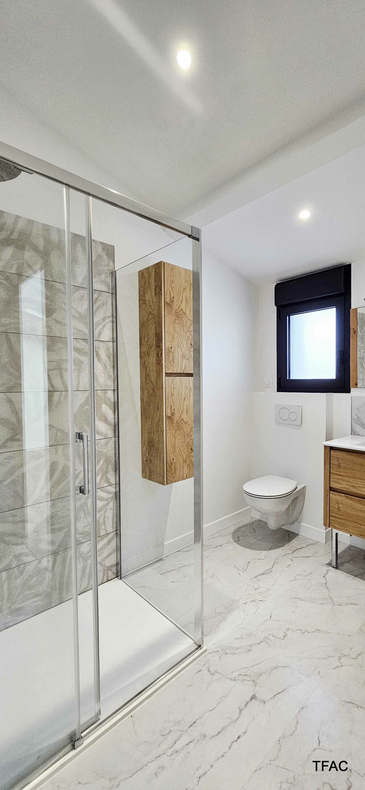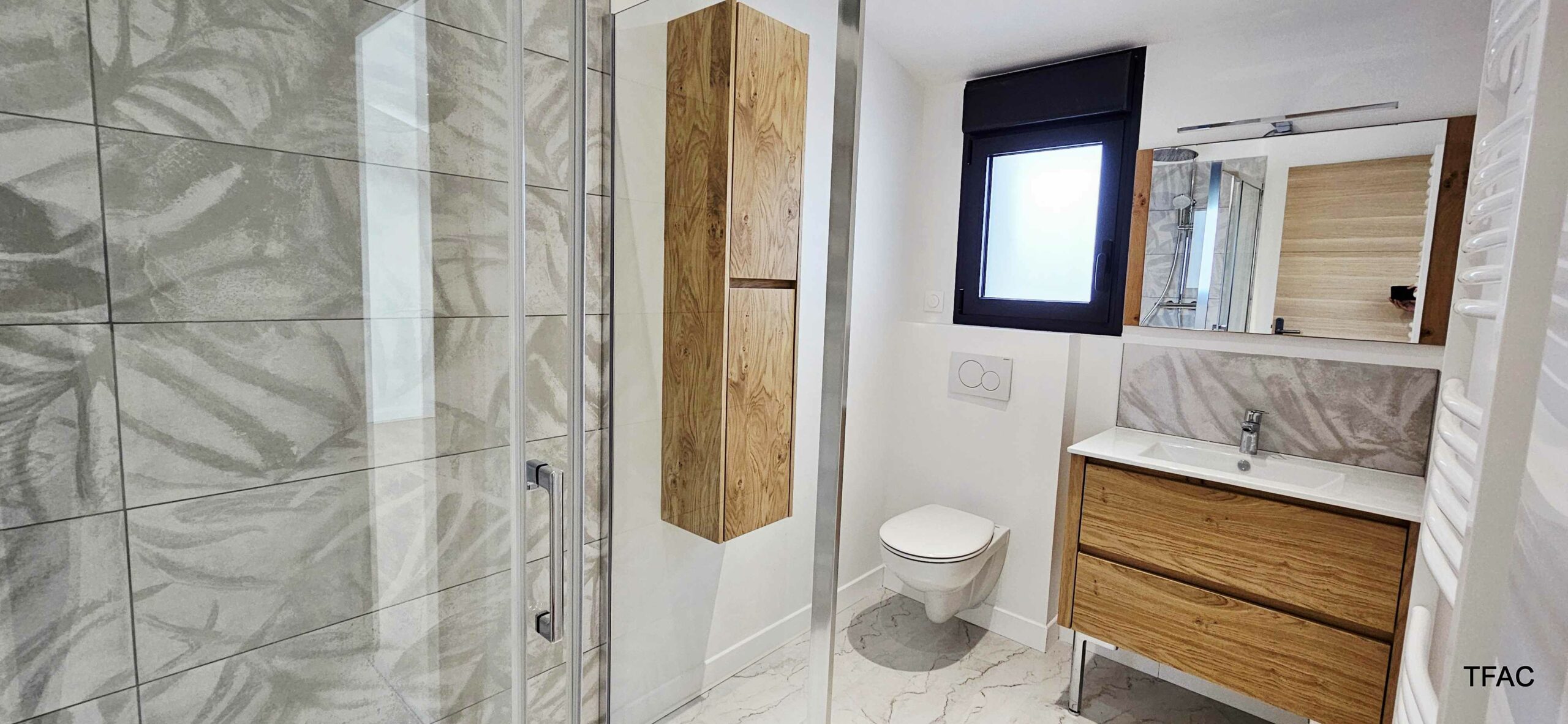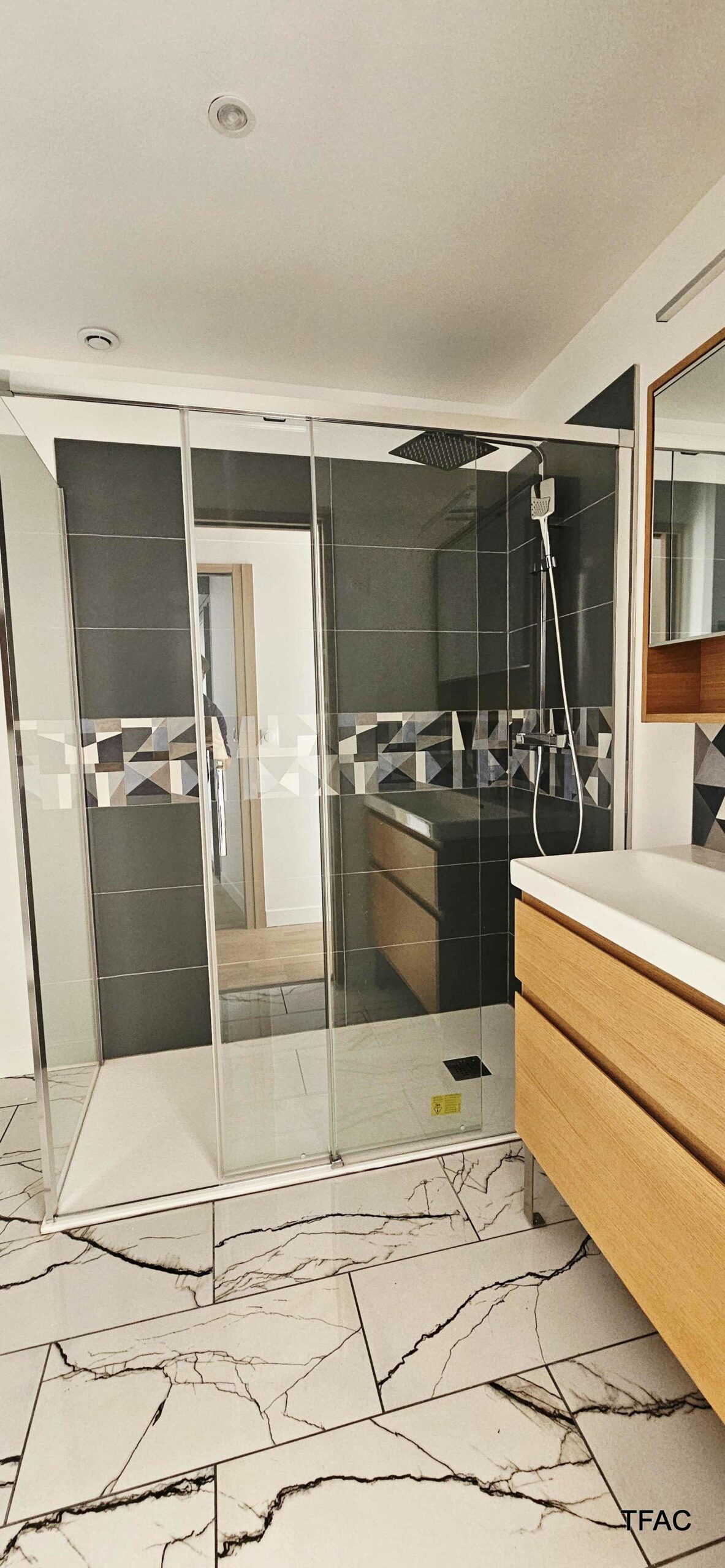 – rez-de-chaussée : un séjour (59.68 m²) avec cuisine ouverte, un premier dégagement (3.18 m²) desservant une chambre (11.53 m²) coté jardinet à l’avant, une salle d’eau (2.62 m²) et des toilettes (2.04 m²), un second dégagement (3.06 m²) desservant une buanderie (7.56 m²), une salle d’eau (4.12 m²) avec toilettes, un dressing (3.23 m²) et une seconde chambre (10.09 m²) coté terrasse plein ciel (40 m²) et jardin à l’arrière, avec une autre terrasse (couverte) ;
