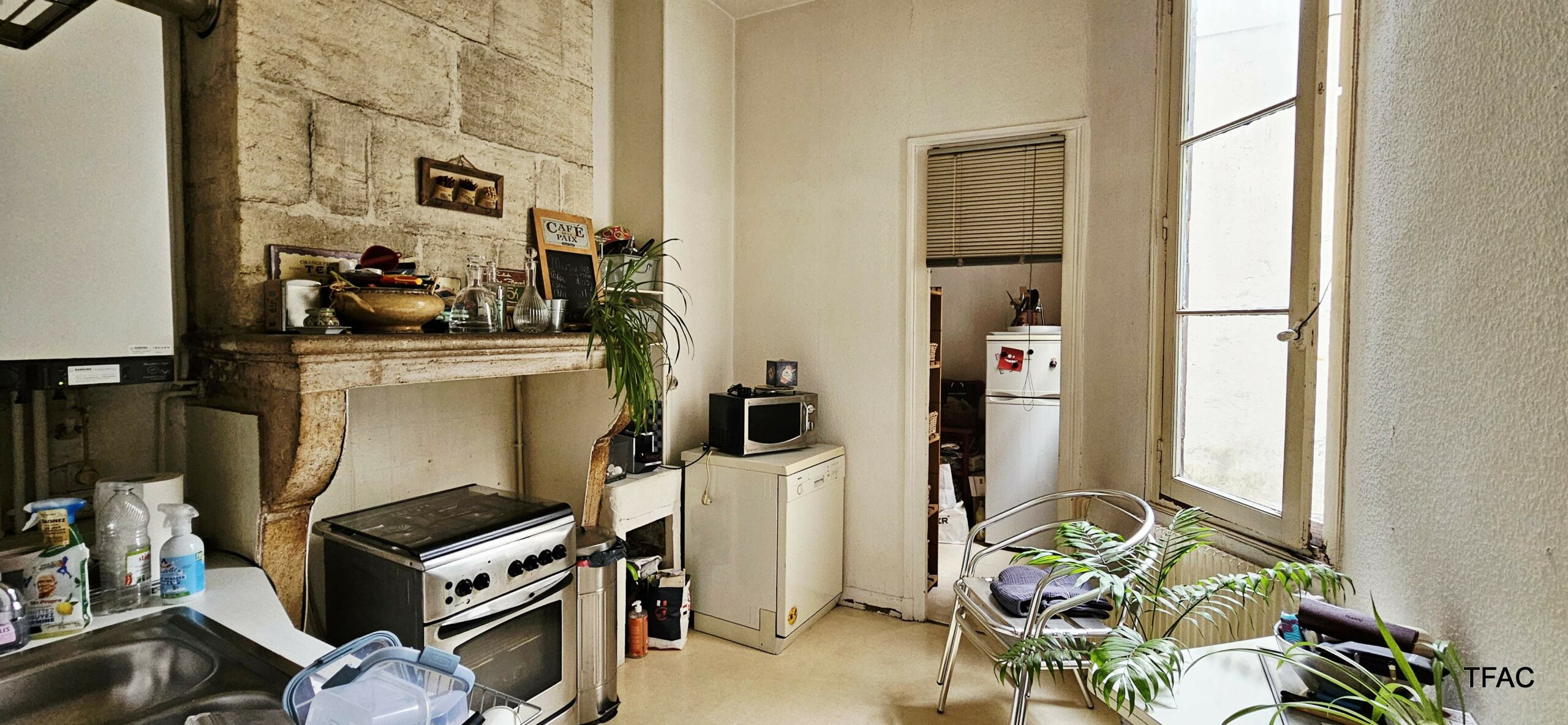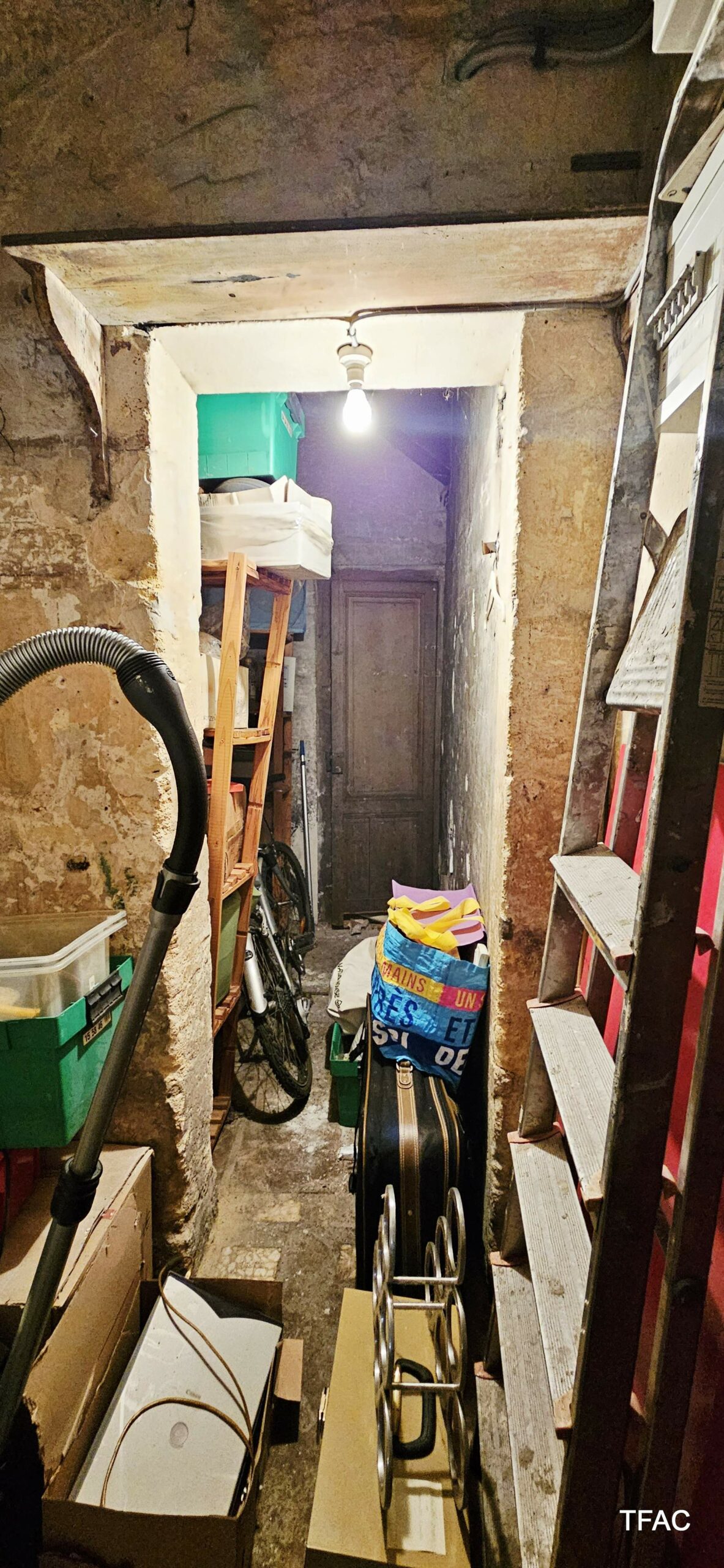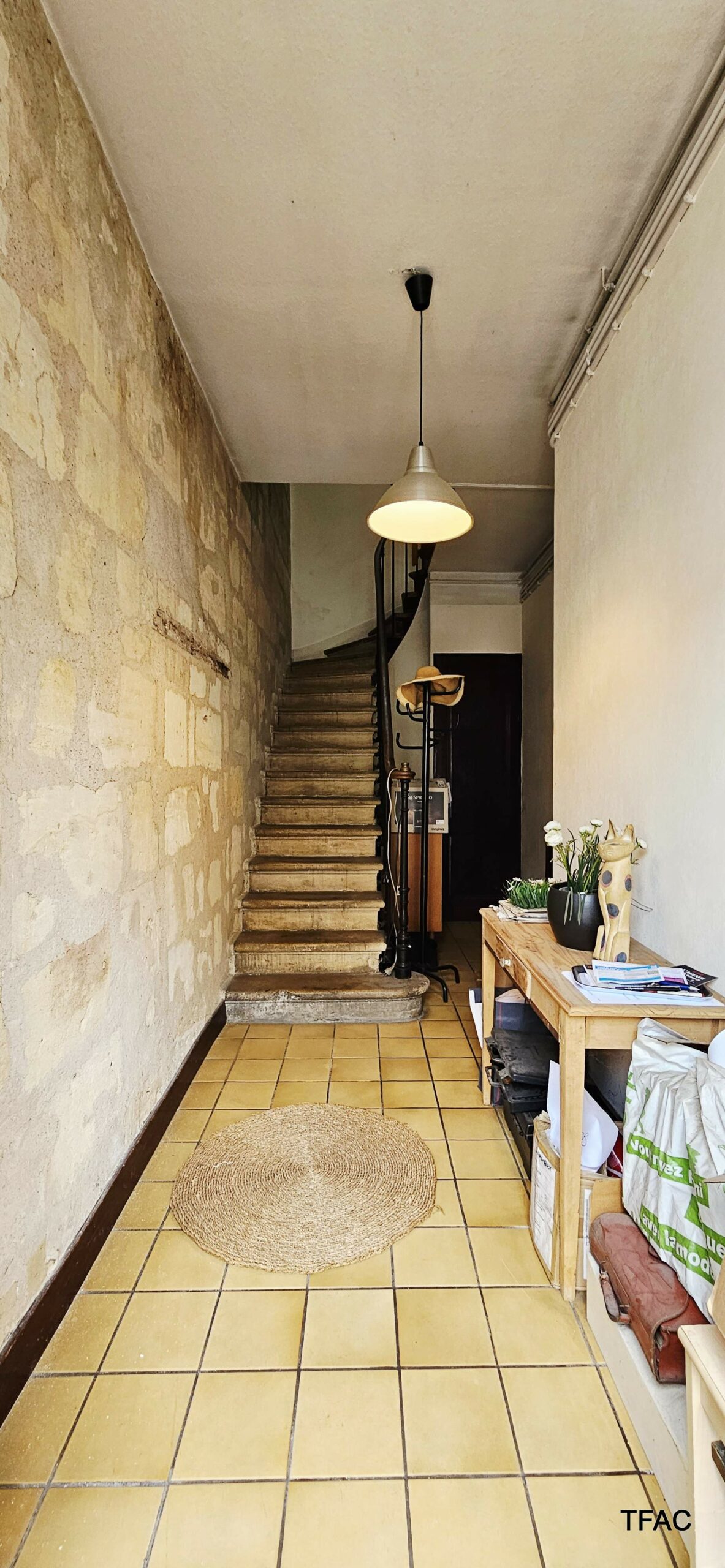 Sur le rez-de-chaussée et le premier étage, un appartement T3 avec entrée privative directe depuis le domaine public – 72.74 m², à rénover, comprenant une entrée (7.59 ²m²), un palier (4.70 m²), un salon/séjour (17.30 m²), deux chambre (12.40 et 9 m²), un dressing (4.36 m²), une cuisine (7.75 m²), une buanderie (4.12 m²), une salle de bains (4.16 m²), toilettes (1.36 m²). Un cellier de 5.56 m² complète l’ensemble. Compteur électrique individuel. Absence d’amiante, présence de revêtements contenant du plomb au-delà des seuils en vigueur, présence d’anomalies électriques, présence d’anomalies gaz, absence d’indices d’infestation de termites, DPE en E-E (estimation des coûts annuels : entre 1 870 € et 2 560 € par an).