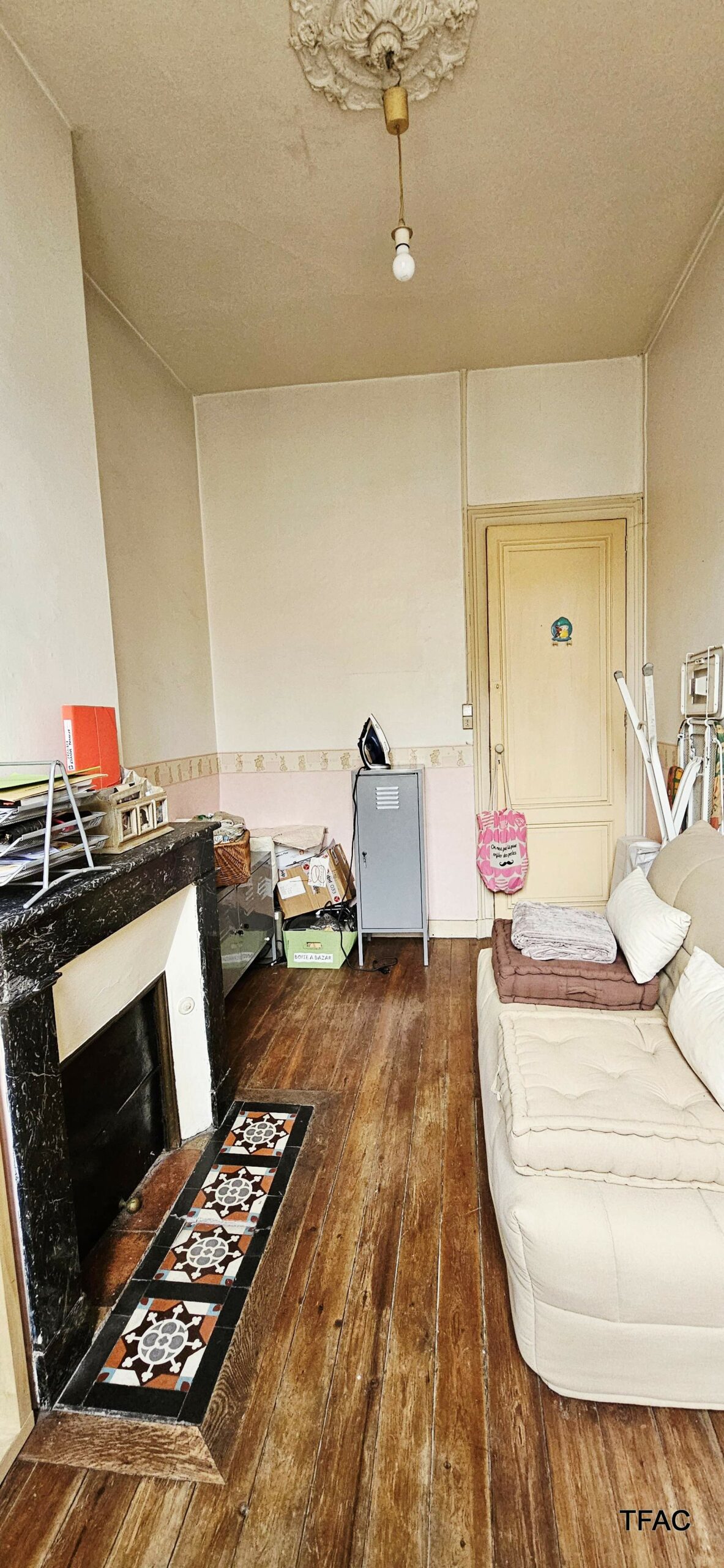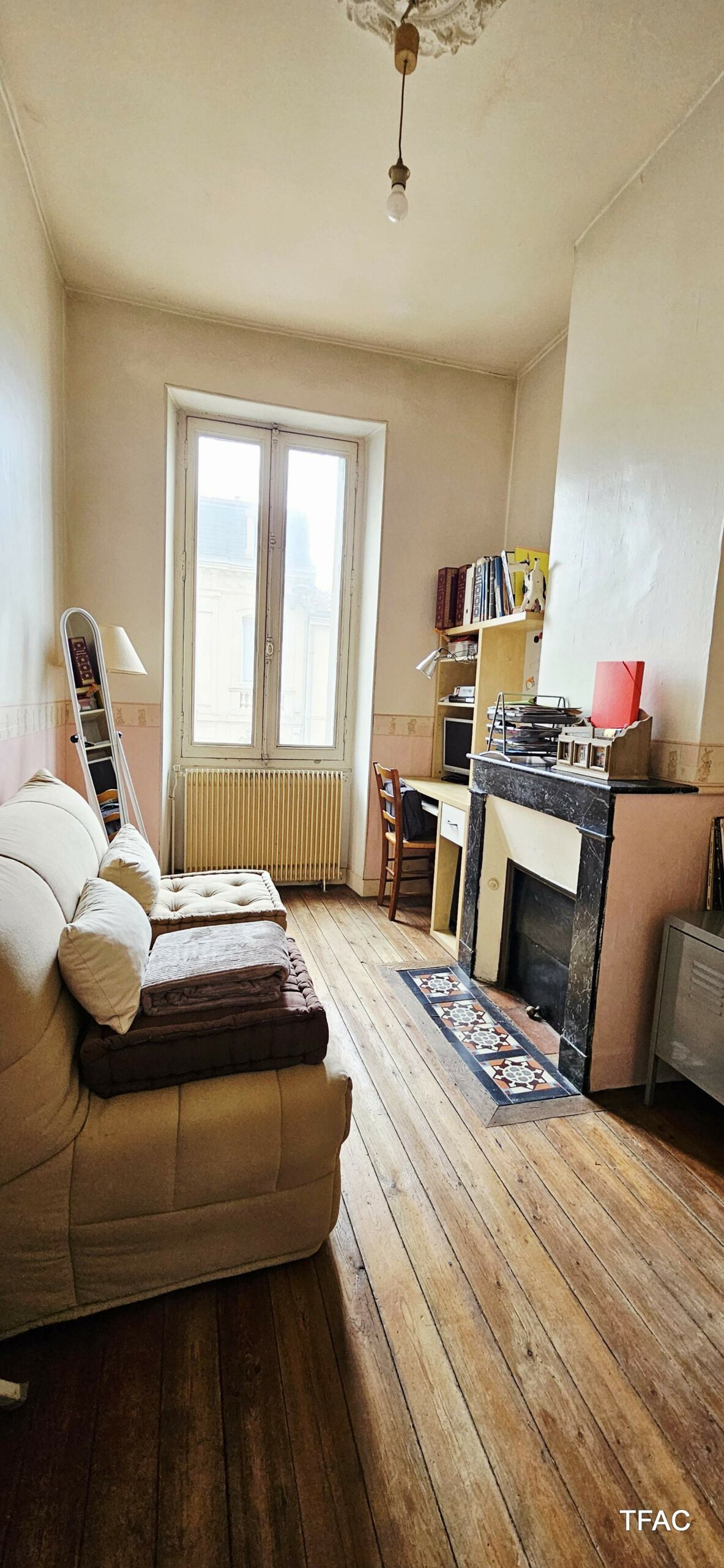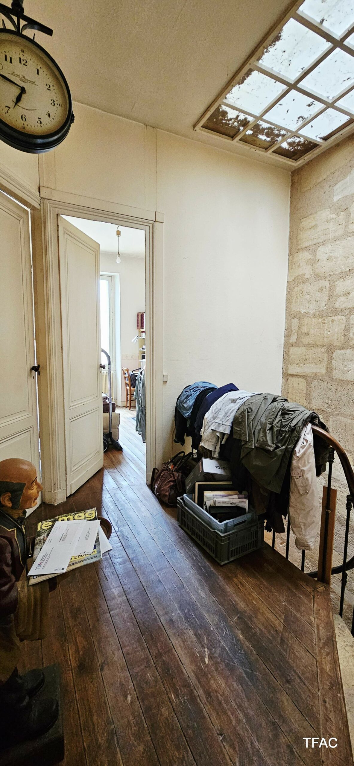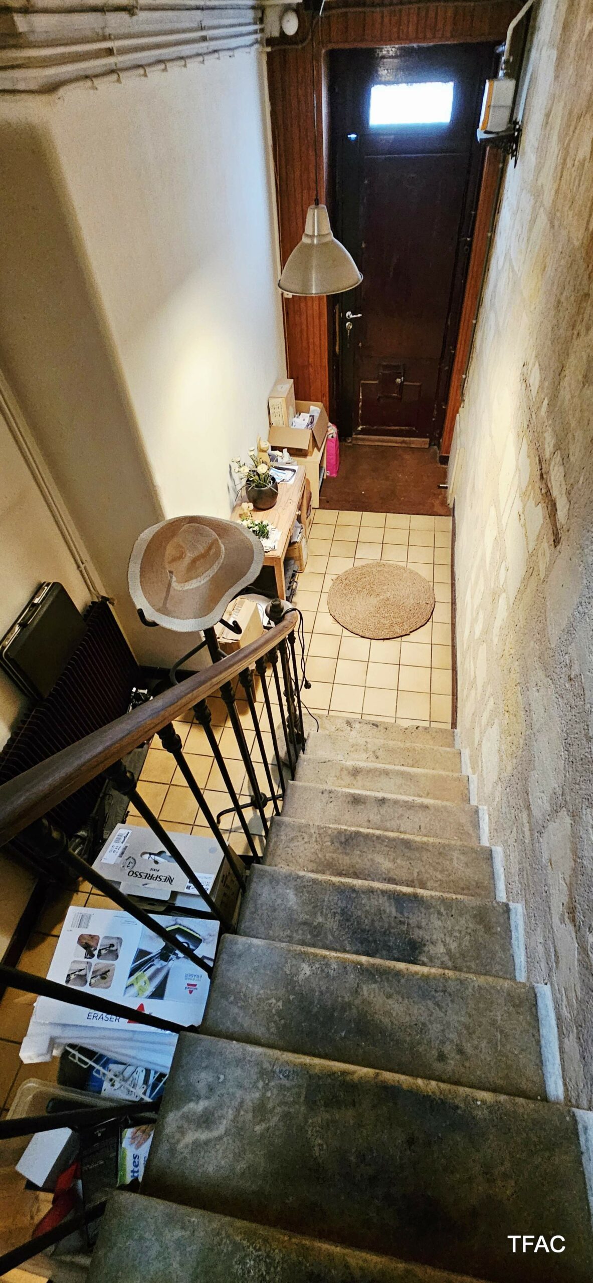 Sur le rez-de-chaussée et le premier étage, un appartement T3 avec entrée privative directe depuis le domaine public – 72.74 m², à rénover, comprenant une entrée (7.59 ²m²), un palier (4.70 m²), un salon/séjour (17.30 m²), deux chambre (12.40 et 9 m²), un dressing (4.36 m²), une cuisine (7.75 m²), une buanderie (4.12 m²), une salle de bains (4.16 m²), toilettes (1.36 m²). Un cellier de 5.56 m² complète l’ensemble. Compteur électrique individuel. Absence d’amiante, présence de revêtements contenant du plomb au-delà des seuils en vigueur, présence d’anomalies électriques, présence d’anomalies gaz, absence d’indices d’infestation de termites, DPE en E-E (estimation des coûts annuels : entre 1 870 € et 2 560 € par an).